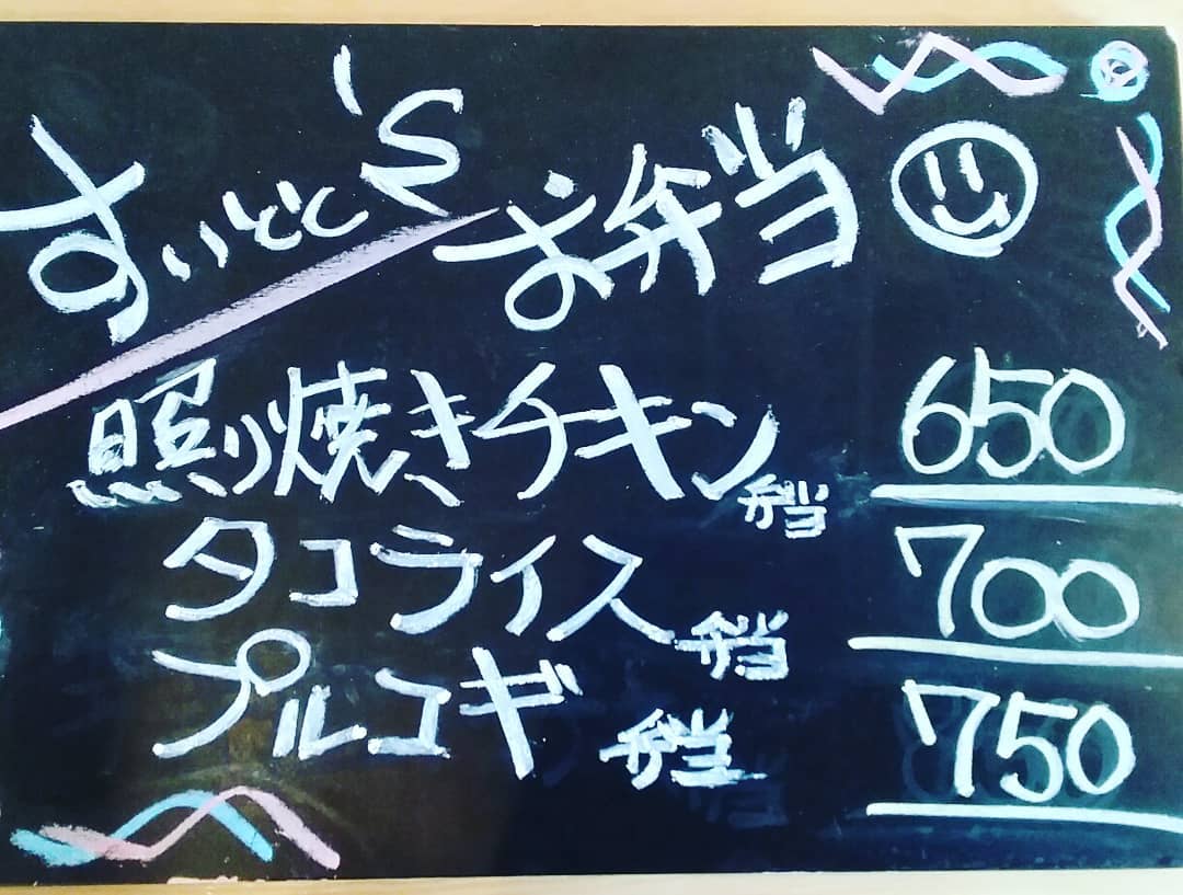 ご注文 お受け致します。 …と言う事で明日の お弁当ラインナップです! 照り焼きチキン弁当 650 タコライス弁当 700 プルコギ弁当 750 の三種類になっております! ご注文、8日9時までに お願い致します…m(_ _)m 【すいとと】 11:30~14:00まで お持ち帰りOK!! イートインにて店内での お食事も可能です。 ☆★☆店内限定☆★☆ 『アサリとトマトのパスタ』 …もオススメです♪ 【鯱家】 12:00~13:00の間に 鯱家店舗にてご注文の お客様のみ受け渡し させて頂きます。 前もってのご注文お待ち しておりますm(_ _)m なお営業につきましては 設備トラブルのため お休みとさせて頂きます。 8・9日目安には 解消予定ですので 追って報告させて頂きます。 ・ ・